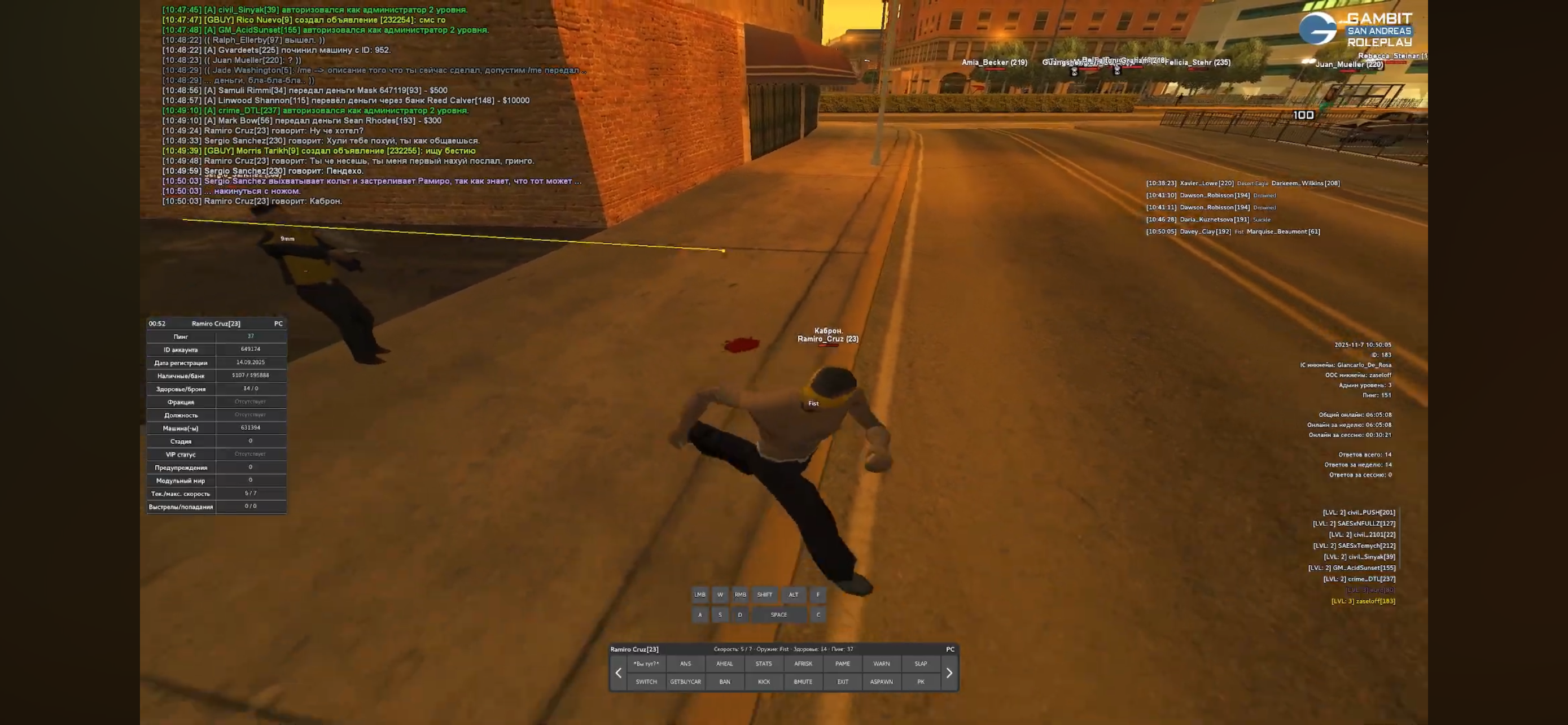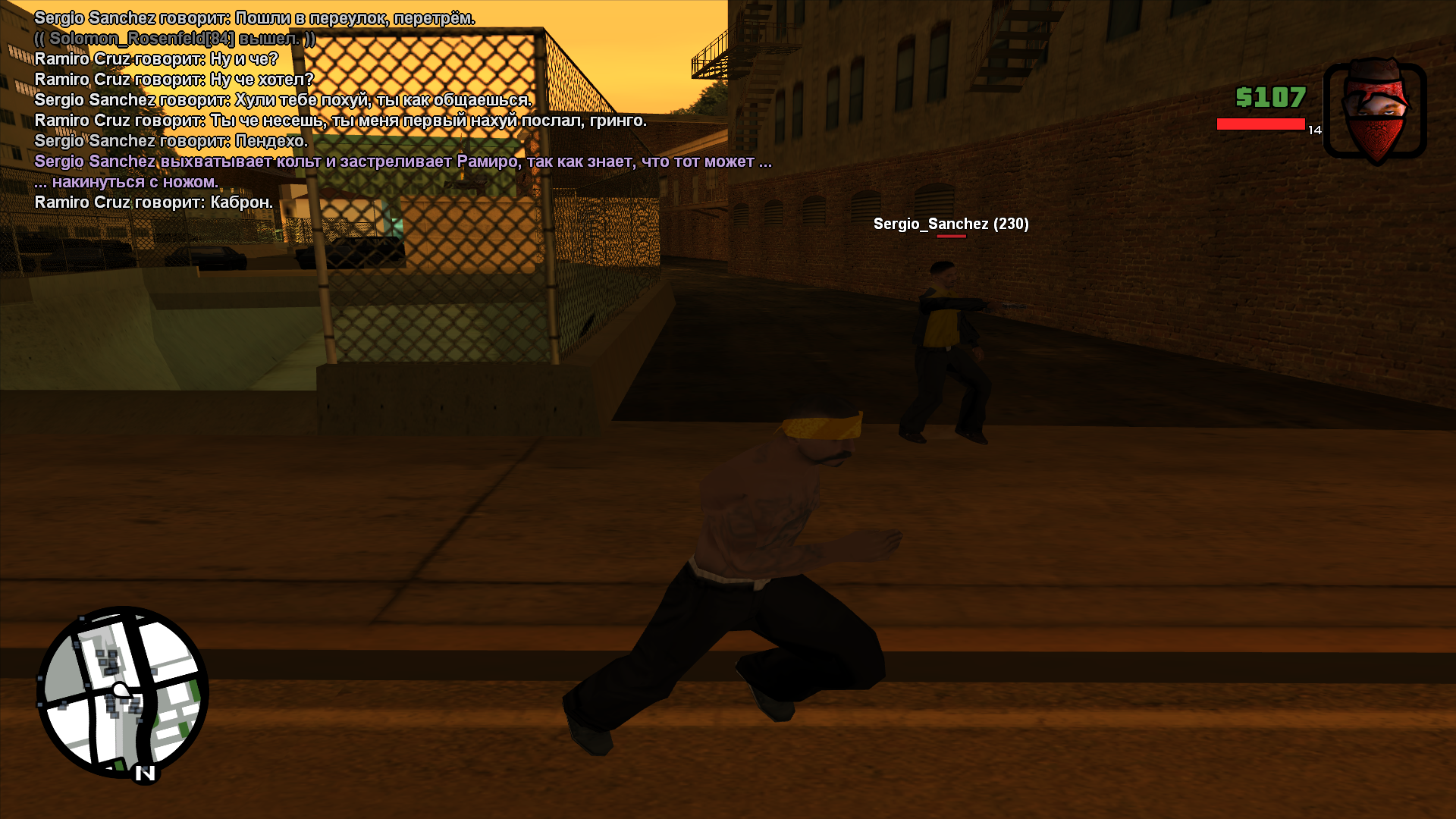 Суть жалобы: Стоял я, и данный человек предложил мне обменять мой нож на его бензопилу + моя доплата. Изначально нож я не использовал, он засветился когда я заспавнился. Я отказавшись от его предложения ухожу, он посылает меня нахуй, я спрашиваю почему он так общаеться. Он говорит пошли за угол, берет кольт и начинает расстреливать меня с отыгровкой "выхватывает кольт и застреливает Рамиро, так как знает, что тот может накинуться с ножом". Высосал причину для килла, сам предложил мне отойти за угол, после чего стреляет из-за опасений моего нападения с ножом про который он по IC вообще никак не мог знать. Явный ДМ