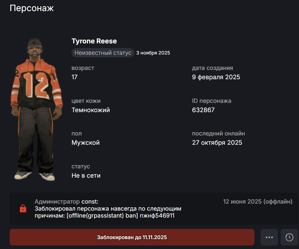Суть жалобы: Можно пожалуйста разблокировать персонажа на 3 дня раньше, мне надо фракцию играть, но надо на этом персонаже понимаете? Пожалуйста