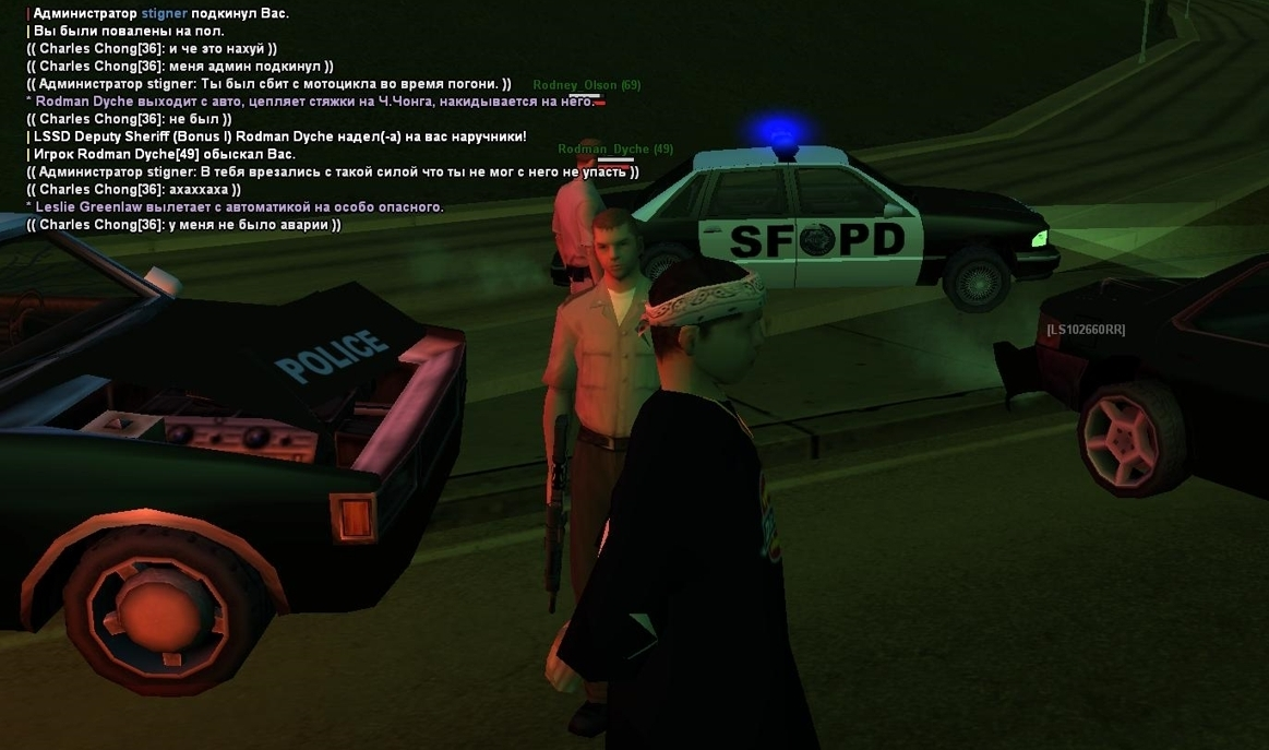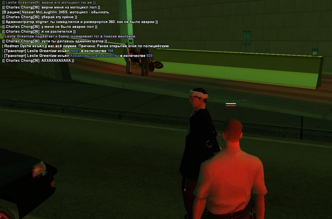окей. меня поймали, в дальнейшем вышел по игре с нормальным составом гнд, а не той нуборобокоп фракцией, именуемой - лссд. идут разборки с администрацией, что же делать? правильно - тыкнуть на колёсико /cuff /frisk /takeitem - собственно говоря.