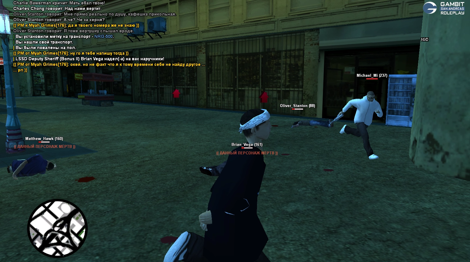 играя персонажа, случилась неприятная ситуация, где персонаж Мэтью_Хавк прийдя на Чайнатаун, как себовец - был свидетелем одной ситуации, аля драка — вкратце каффнул человека одной отыгровкой, без шанса отыгрыша какого либо минимального сопротивления, в следствии чего напоролся на шот. был убит непосредственно на квартале в составе ещё двух детективов и своего же напарника. ситуация уже началась с объективной говнистой игры. я жду когда соигрок зальёт фрапс относительно всей этой ситы, дабы прочуствовать ролеплейчик со стороны себа