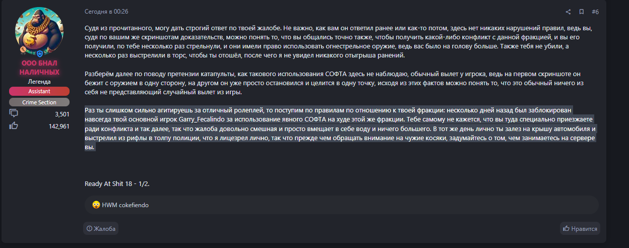 «Ты, походу, даже суть жалобы толком не прочитал, в конце чётко написано, что мембер ихней банды в OOC оскорбляет. Это уже тянет на бан, не подумал, вась?»
