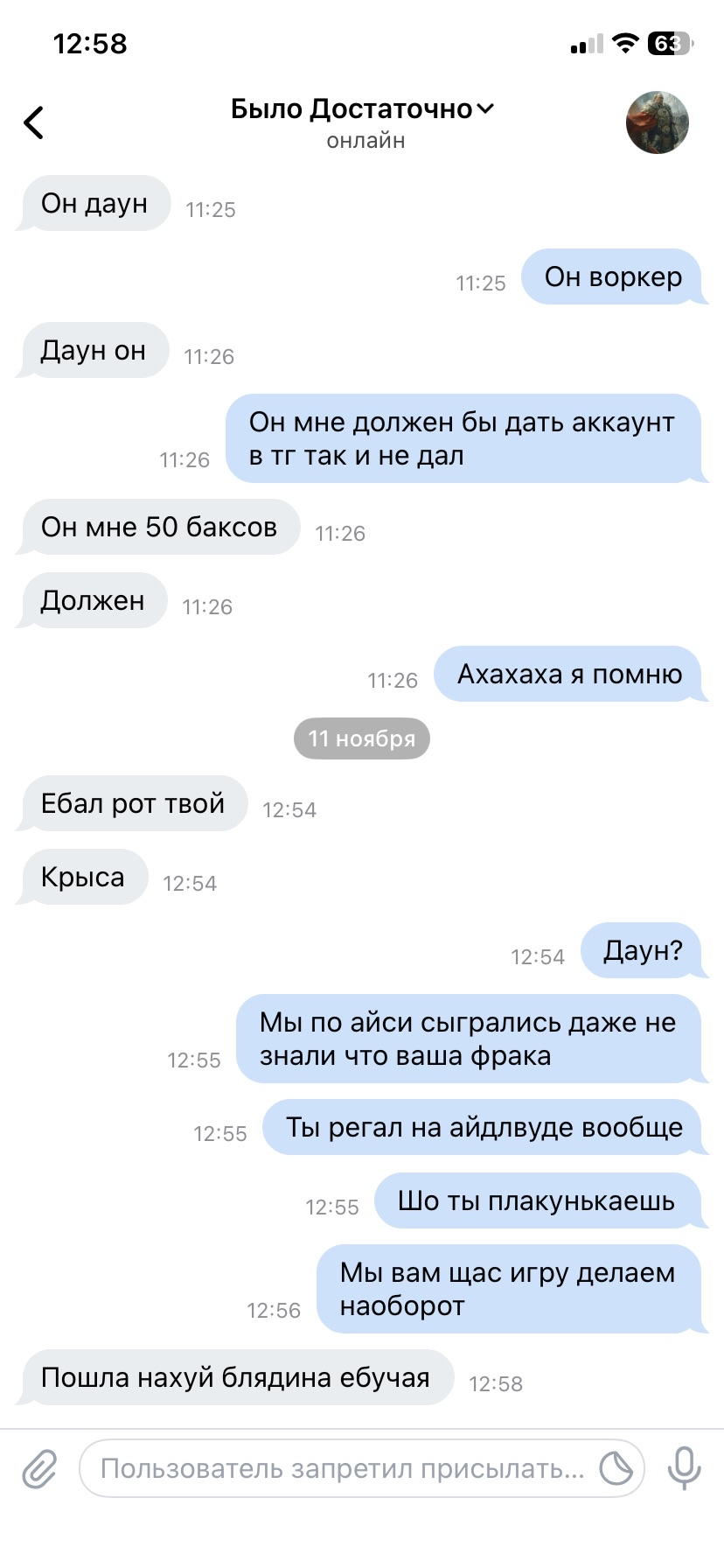 — Зачем мне твой со-игрок пишет в лс форума? Я не Вася, и не считаю что оос оскорбления тянут на блокировку, тем более в социальных сетях.