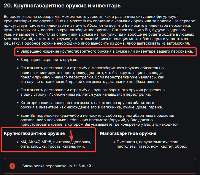 Создается вопрос, почему мачете нельзя спокойно носить под одёжкой, как и тот же глок. Даже если будет чехол. А так же, почему администратор не наказал тех, кто создали тех драку без каких-либо отыгровок. За что и были на худе отправлены в 3-ю стадию.