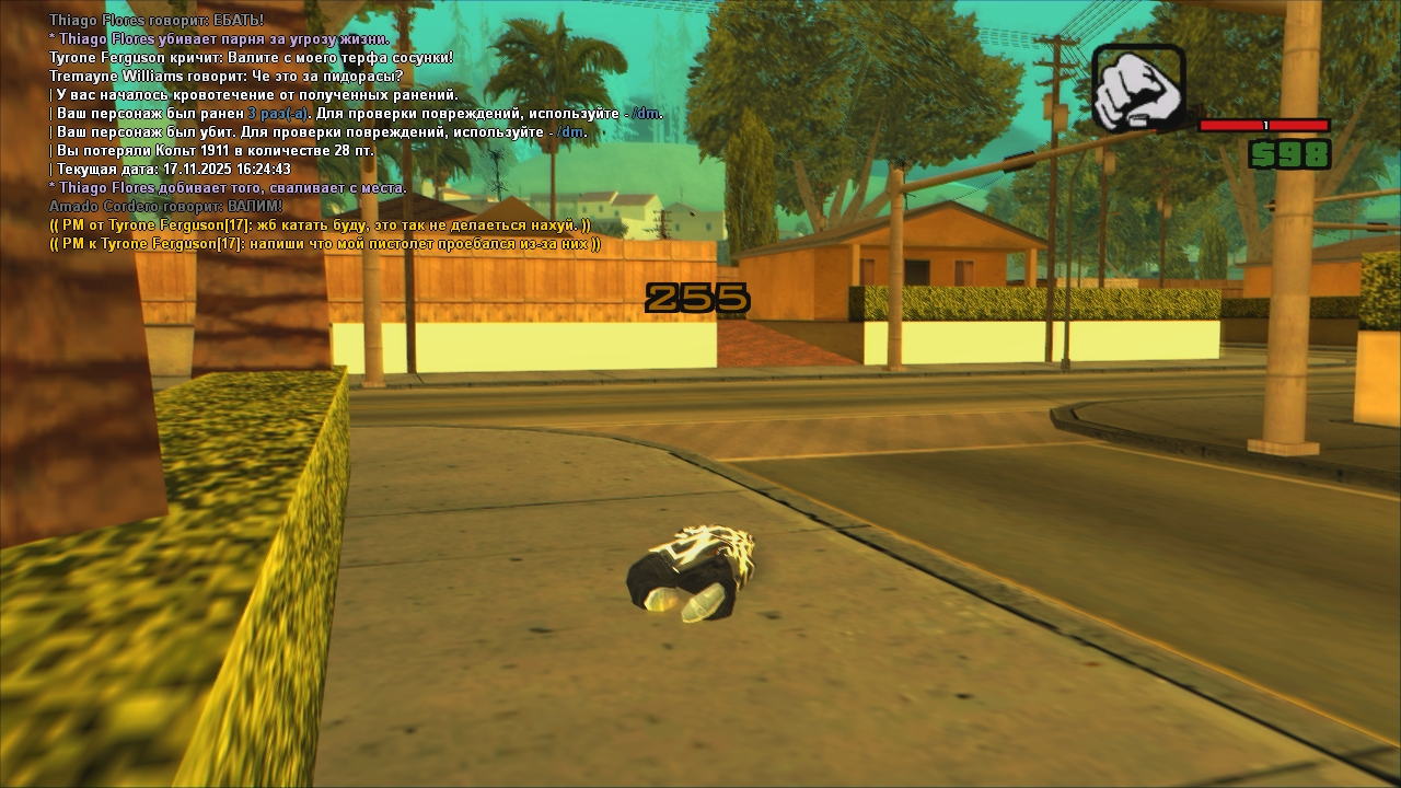 Суть жалобы: Вообщем, эти игроки а точнее Thiago_Flores, начал всячески провоцировать моего персонажа, оскорблять. (на худе деействующей банды) вообще не боясь за свою жизнь. Я вышел из машины с битой чтобы отогнать шакала от своей машины, за что тот открыл по ммне пальбу за якобы угрозу его жизни. Когда он начал стрелять по мне, его как я предпологаю соигрок Amado_Cordero, в свою очередь открыл огонь тоже. Прошу наказать этих игроков и еще попрошу о возвращении биты.