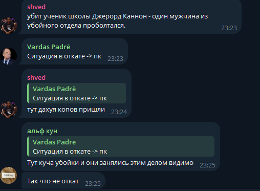 как всё было: чувачка, а именно Джеррода, доёбывали три чувака, я, который пришёл во фраку в принципе с целью урегулировать такое — заступился за него, драка на кулаках была, в которой я выйграл. думал, что больше ничего подобного быть не должно, но после прям на уроке чувак вновь позвдорил с тем, обосрав, ударив бутылкой, после чего при всех вылил содержимое на Джеррода, который явно проблем не хочет. думал, что после уроков поговорю с обидчиком, максимум дело до кулаков вновь дойдёт. но по выходу из школы стоит куча детективов, и вездее ходят возгласы, что безобидного чувака над которым итак издевались — зарезан был прям на курилке. мой персонаж даже не стал разбираться во всём этом, и пошёл на крайние меры. Так-же у нас в школе есть активная компания ребят, которая старается все такие ситуации — исключить, не без насилия конечно но у нам есть своё "БРАТСТВО", долгая история канеш, но если желаете, то позже расскажу.