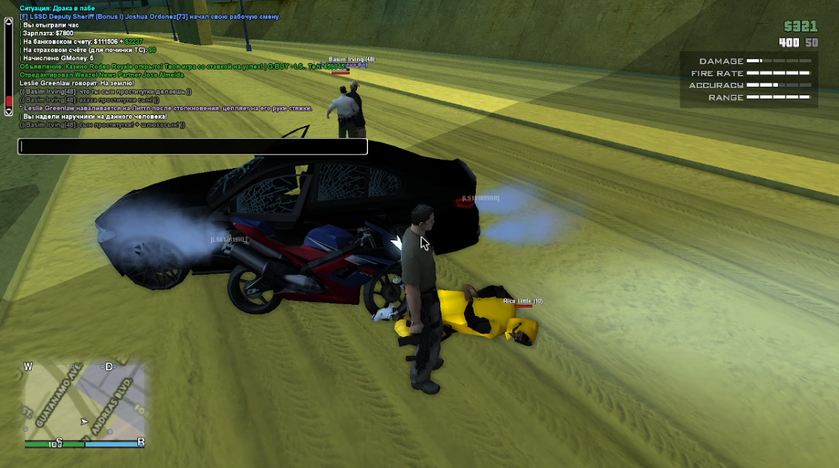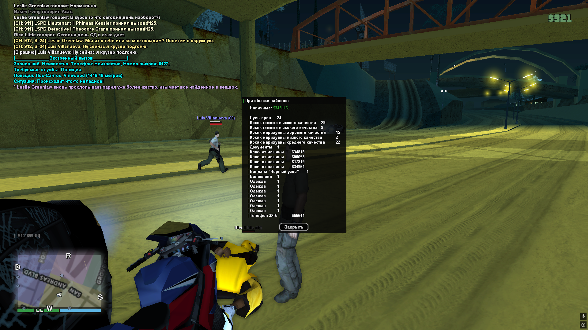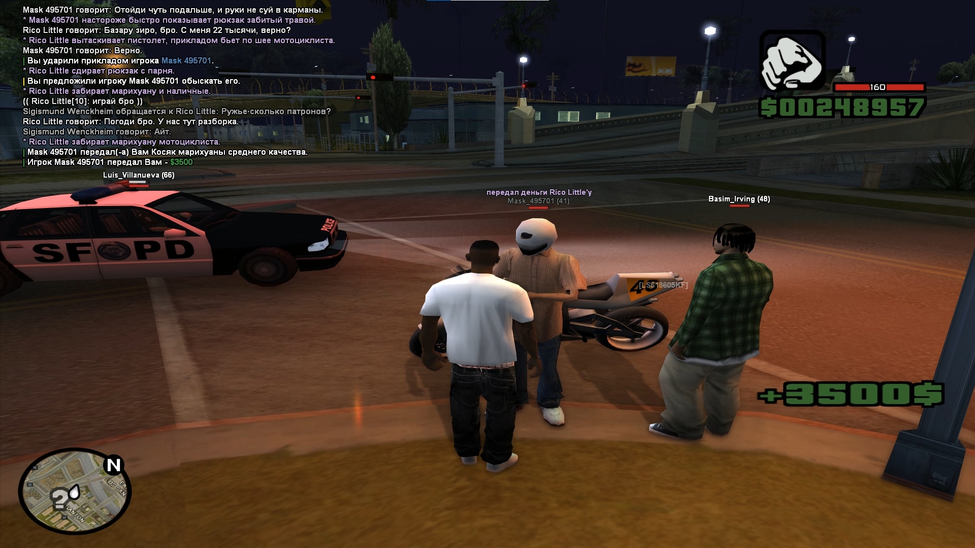 спустя какое то время подъехал тип на мотоцикле в маске, шлеме, начал предлагать купить у него партию марихуаны, естественно наш ответ на это был ограбление с использованием огнестрела. (ни одного выстрела по итогу всей ситуации нами произведено не было). парень тянул время как мог, минуты 3 стоял и втыкал, и передал 3500$ и 22гр марихуаны только после того, как рядом проехал сдшник - Luis_Villanueva.