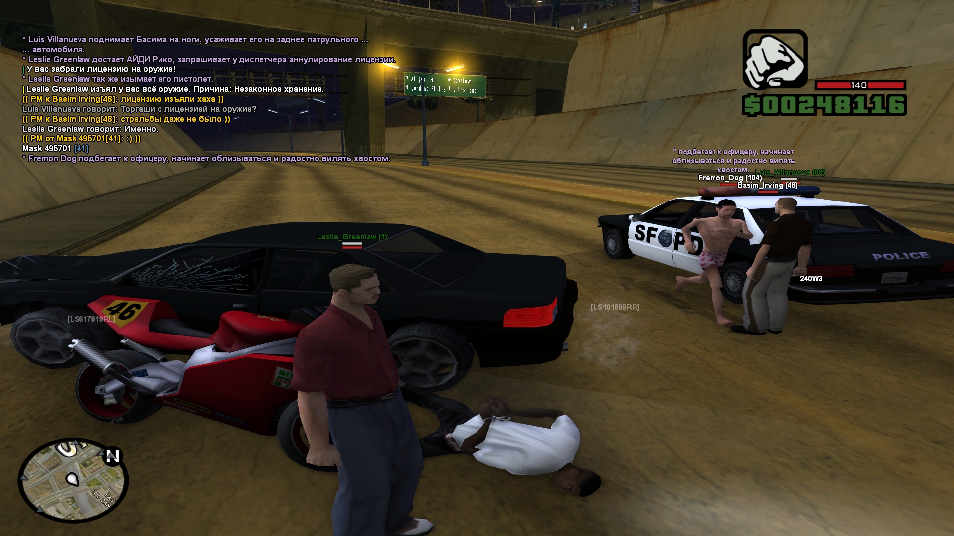 начался чейз, после непродолжительно преследования нас все таки сбили с нашего мотоцикла и взяли под аррест. IC персонажи были очень разочарованы ситуацией и отвечали дуо сдшников сугубо грубо, не говоря никаких подробностей. на месте было изъято все оружие, наркотики и начальная лицензия на оружие, приобретаемая мной еще до перепродажи проекта за GMoney. использовал ее строго ООС и никак не злоупотреблял ей на протяжении многих годов игры. сразу после того как была аннулирована лицензия, ограбленный мною парень в маске отправил мне пм с содержанием - "