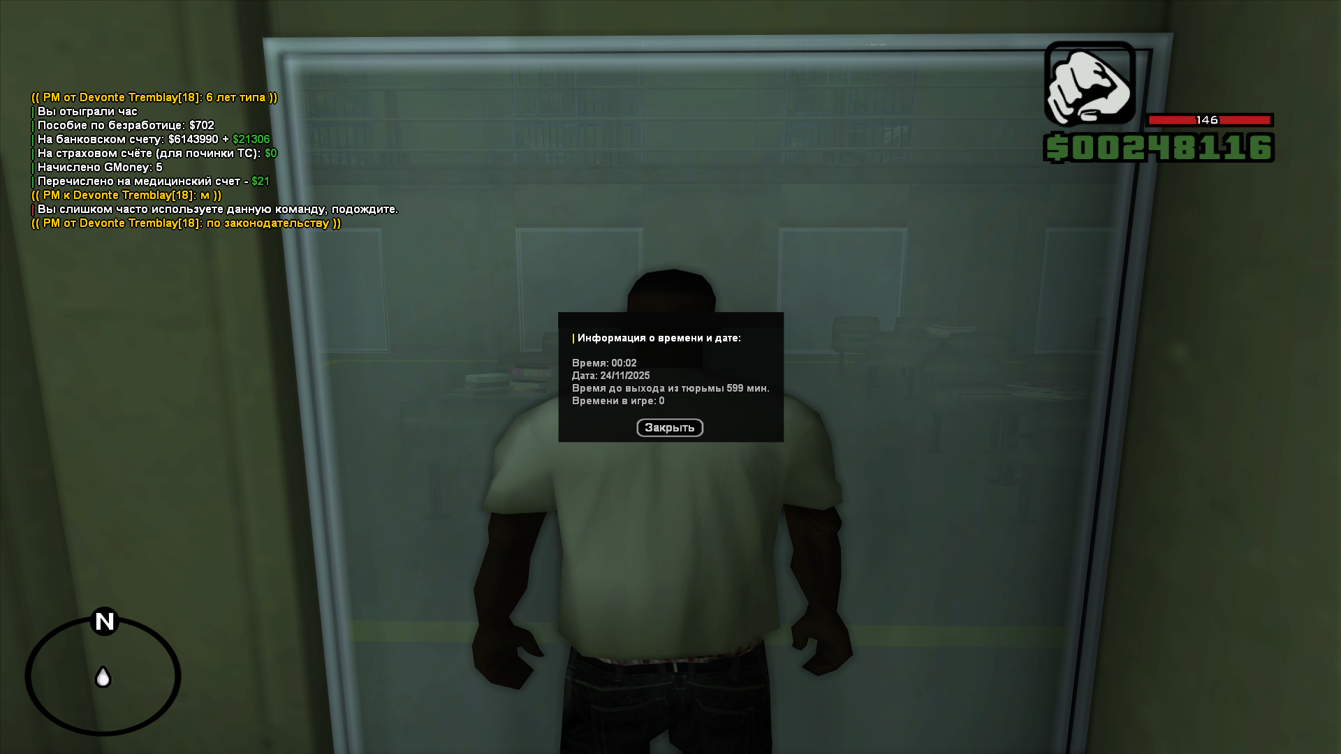 далее за отказ от сотрудничества с детективами из-за личных убеждений персонажа мне дали 600 минут садока.