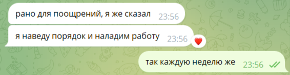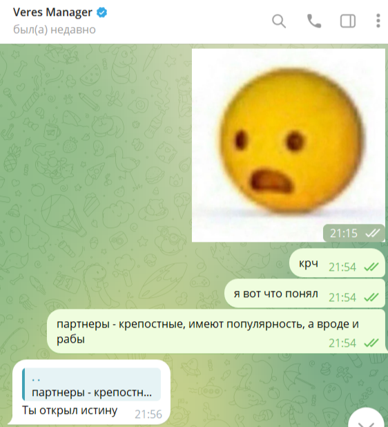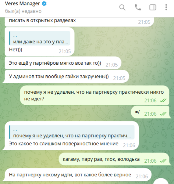 Также я ахуеваю с наглости от нашего куратора и в целом менеджмента, я являюсь партнером уже две недели, вчера уже начался подсчет третьей, но мне задерживают выдачу поощрений на что я писал в личные @Happiness - ответа не получил, поэтому мне приходится на своих двоих и двоих @syrin.exe весь контент клепать. Аж боюсь спрашивать что у остальных, но вот что дал мне куратор форест: