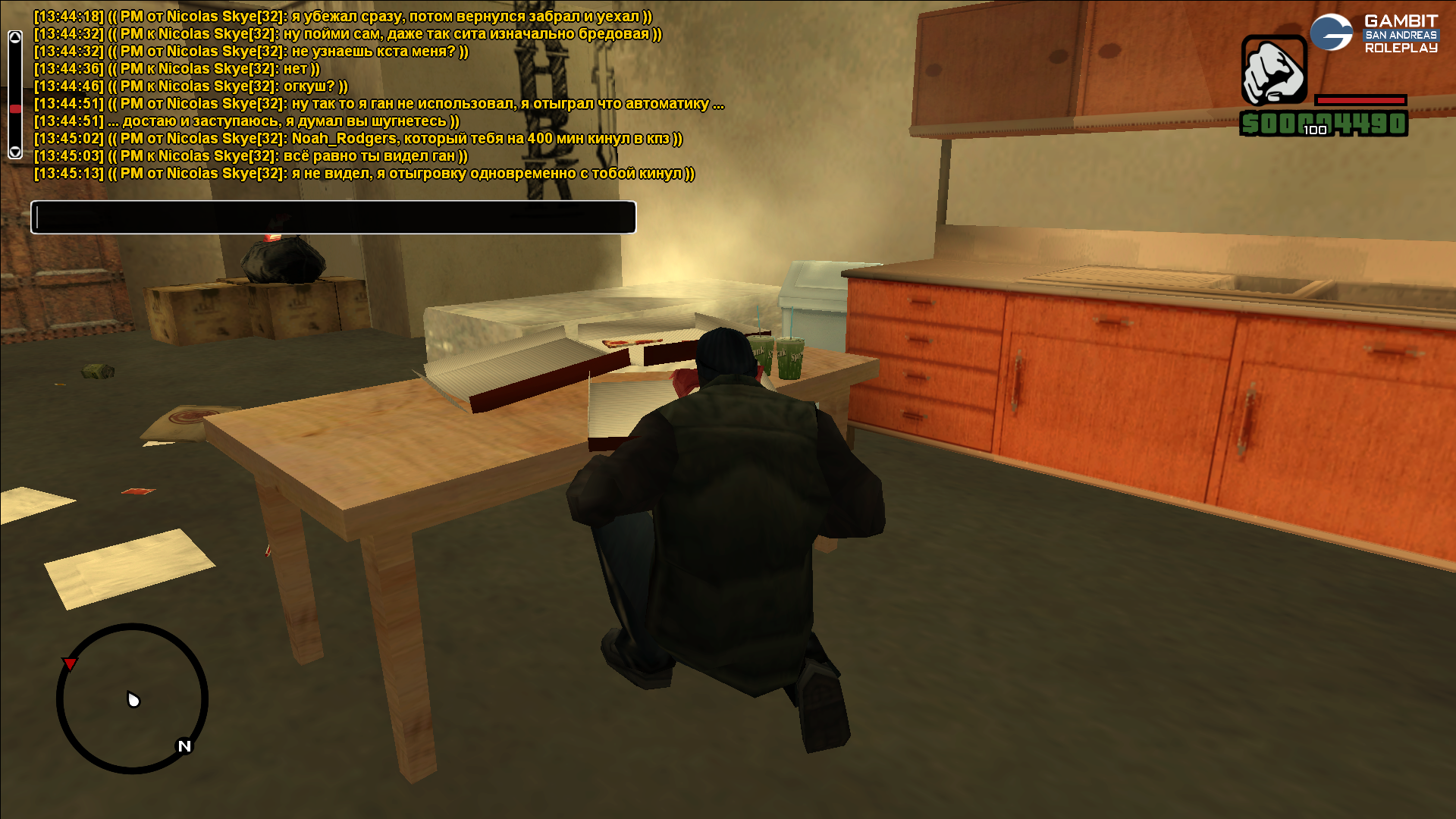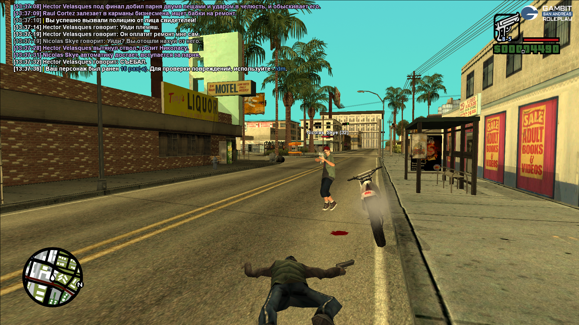 Суть жалобы: не договорились насчёт ситы в игре, не пришли к общему выводу, но ситу доиграли. Тип при виде как грабят итальянца Вито впрягся за него, а когда я достал пистолет и пригрозил ему, велев уехать отсюда подальше - он достал мп-5, от чего я открыл огонь, и он по мне. Пострелялись, но не умер никто из нас, у меня стадия была, у него - ранения