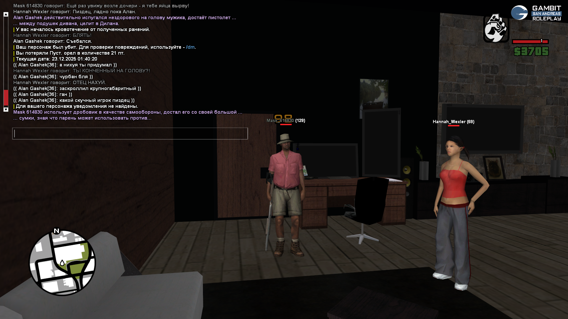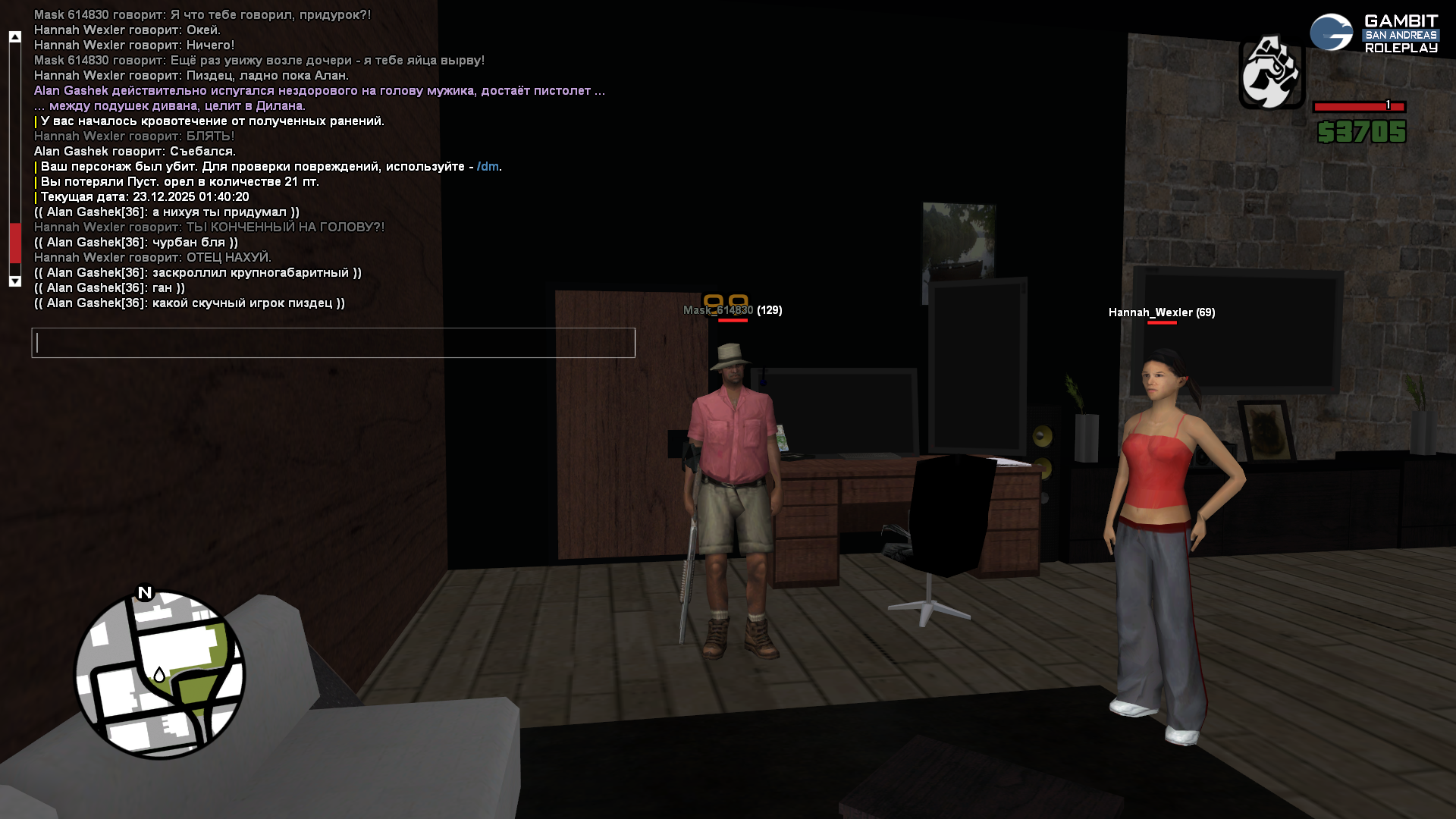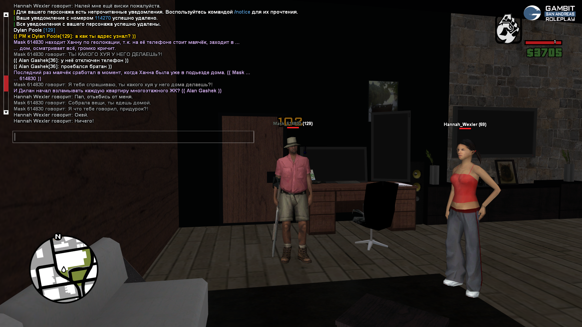 Суть жалобы: игроки отыгрывают ёбнутую семейку, где деспотичный отец максимально ограничивает свою дочь, с которой познакомился мой персонаж. сначала он увидел нас в её доме, угрожая мне дробовиком выгнал из дома, после я забрал девчонку и увёз к себе, перед входом в дом сказал отключить телефон, что она и сделала, отыграв это в чате. но, спустя 20 минут мне приходит уведомление персонажа, и я вижу, что папаша взломал дверь моего дома, на ответ как он вычислил конкретно мою квартиру - он ответил что использовал локатор в телефоне дочери, который она, напомню, отключила раз, а два, даже если бы он был включен, то идеально попасть в нужную квартиру многоэтажного жк на родео - очень маловероятно.