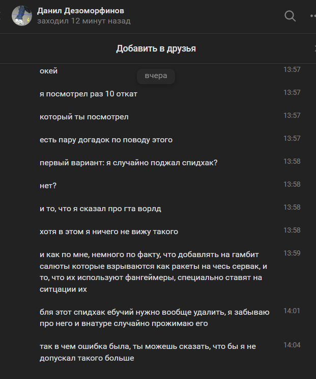 третий косяк -> видео ты сам видел, где твои кореша с которыми ты 24/7 ездишь на алогине и играешь ис ищут какого-то мужика и откровенно палится по ВХ, а ты как администратор сидишь и молчишь. Никто не просит тебя банить -> но пресечь это в Б/ПМ/в ДС ты должен. Тебе тех загадал загадку, что на этом видео не так, говоря о том, что кенты твои используют ВХ, а после этого ты сам пишешь тех админу что подумал и понял -> ты прожал СХ. Чит который администратору совсем не нужен для обеспечения им полноценной административной деятельности