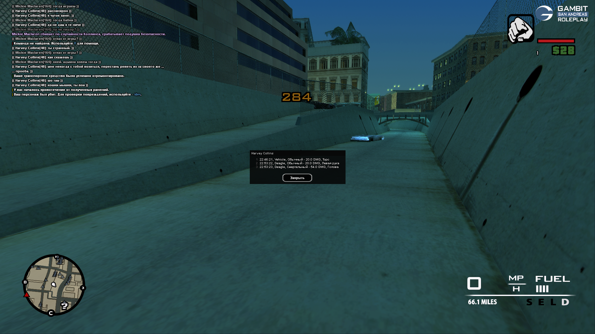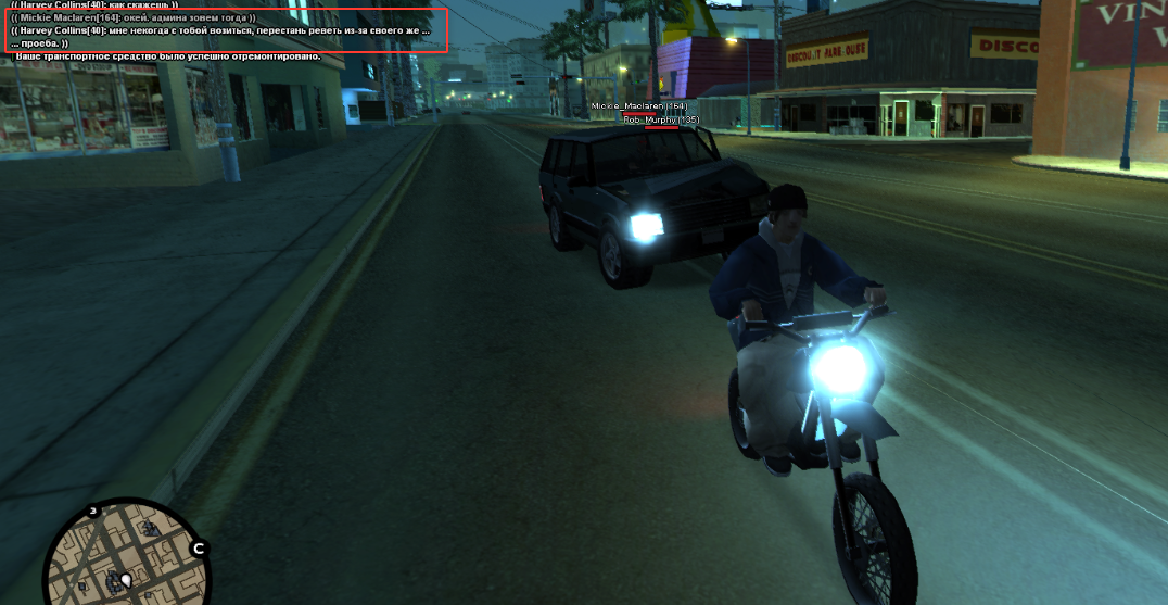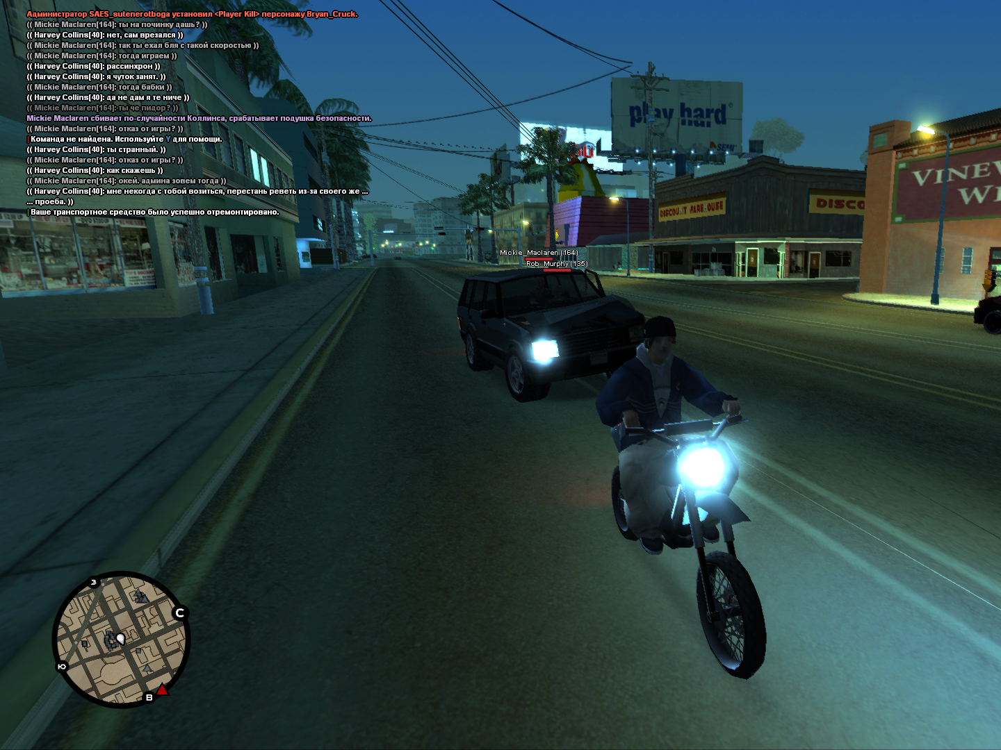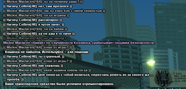 Отыгрывать ДТП мне не сложно, но когда мне предъявы кидают, что я гоню на полной скорости тараня его Хантли - помоему хуй знает, странно звучит. Лично я считаю, что в ситуации виноваты оба. Конкретно я не отыграл "ДТП"? Которое по сути является фальшем. По этому я не могу винить свою не правоту, просто предпологаю.Но я не понимаю прикола ездить за мной и пытаться шотнуть, будто-бы от этого что-то измениться.