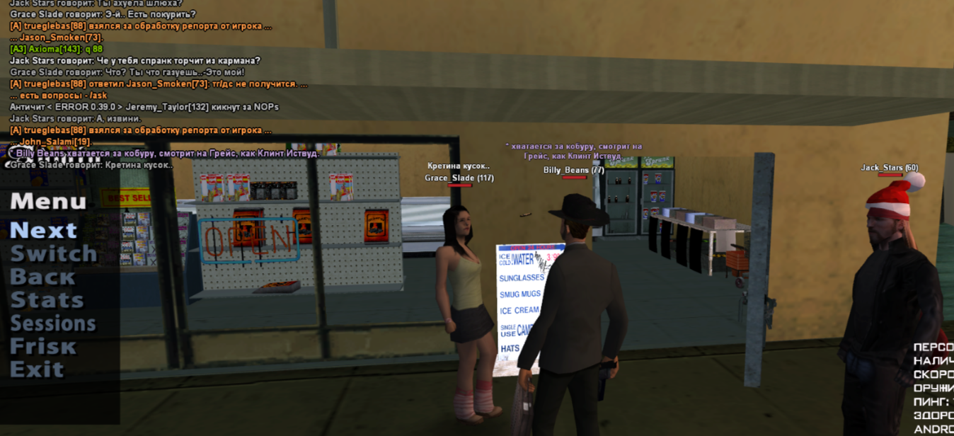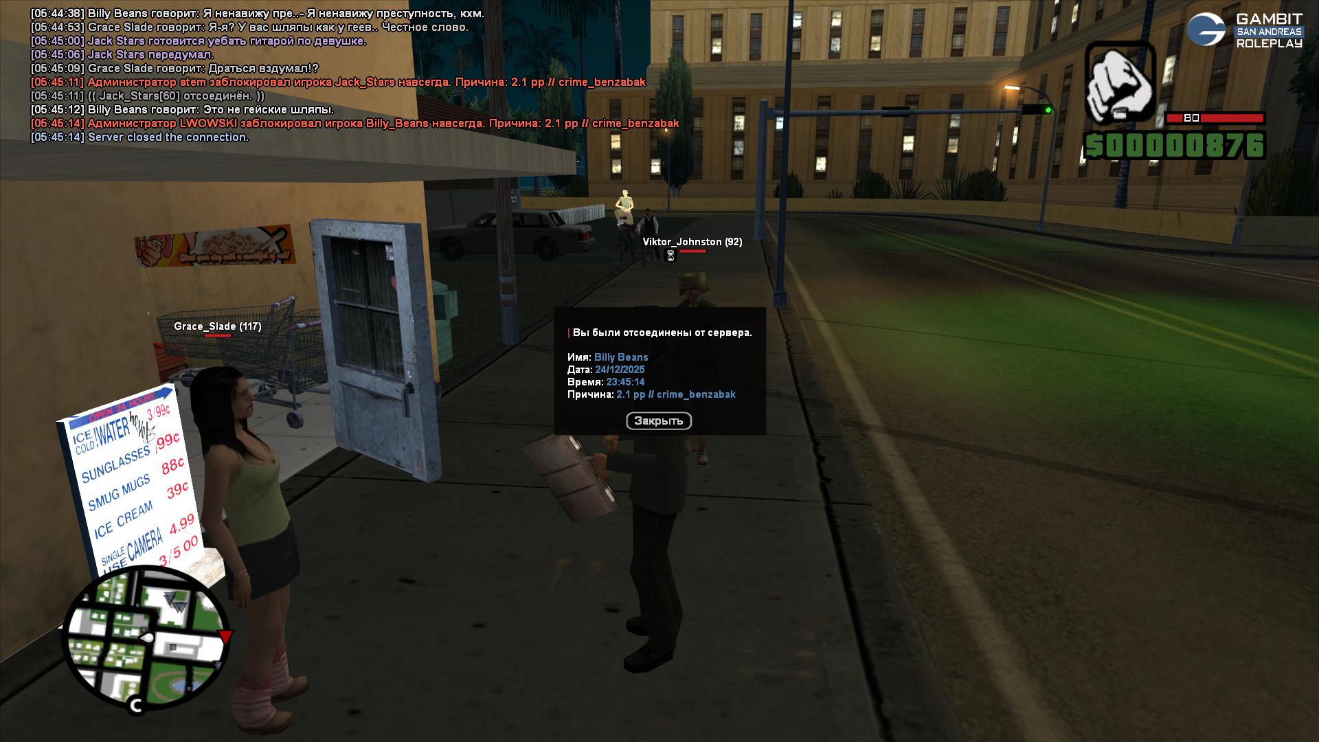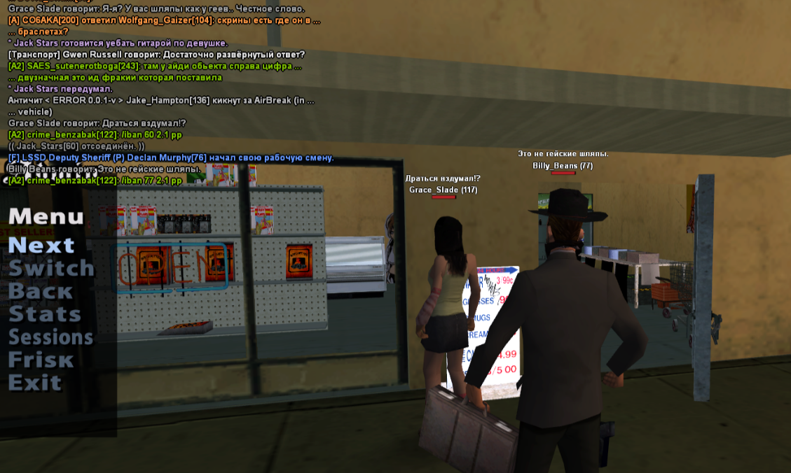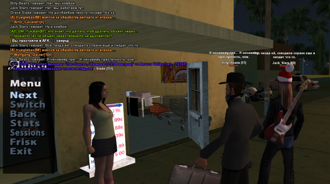 Суть жалобы: получил бан навсегда за 2.1, с чем не согласен. Сразу разъясню ситуацию так, как вижу ее я - играли возле магазина вместе с другими двумя игроками, персонаж 14летней девочки украл в магазине банку газировки, мы с другим игроком заметили это и я отыграл как схватился за кобуру, на вопрос "Вы из мафии?" я ответил, что мы ковбои, и я в этом ничего нарушающего ролевой процесс не вижу. Можете проверить мою квенту, такой образ соответствует моему персонажу (подозреваю, что администратору не понравились мои аттачи и моя манера игры). Я не сделал буквально ничего чтобы попасть под блокировку, тем более навсегда. Согласен, что Джек вел себя не совсем адекватно, но это же не повод сносить всех, кто стоит рядом с ним. Я не являюсь его соигроком, а просто проезжал мимо. Я уверен, что на фрапсе администратора не будет видно нарушений с моей стороны, поэтому прошу разбана. Еще было бы здорово разъяснить за что именно я получил бан, т.е на каком моменте администратор решил, что я нарушаю 2.1.