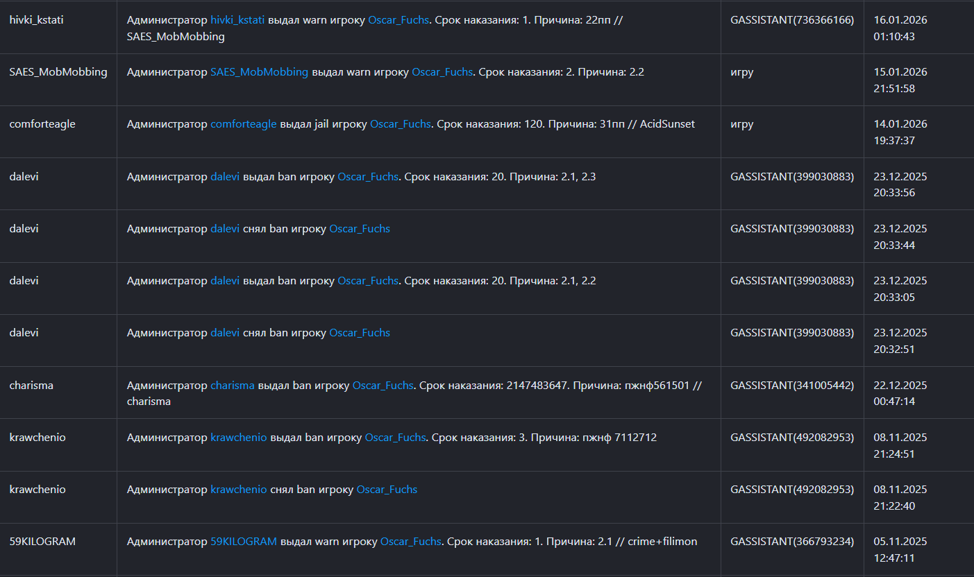 Приветствую. Начнем с того что 15 января ты попытался сорвать митинг и получил свое первое наказание за 2.2 от меня, на тот момент это был твой второй варн.