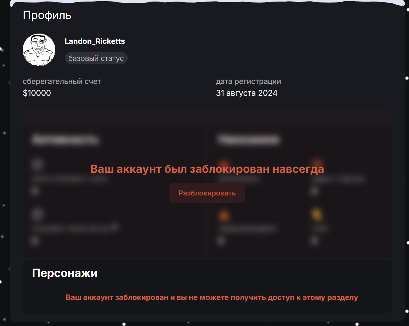 Могу тебе предложить сделку получше - обнуление ЛК, оставлю лишь персонажей и разбаню. Пойдёт?