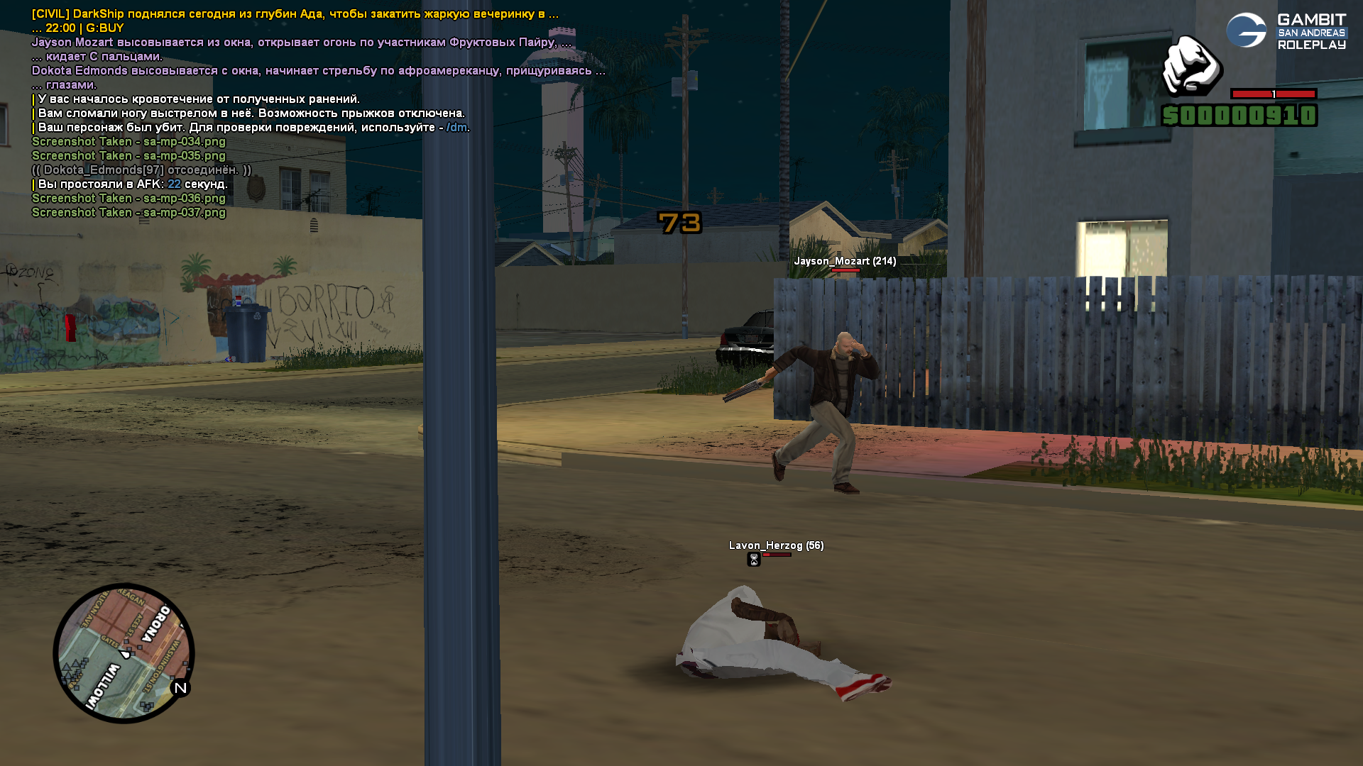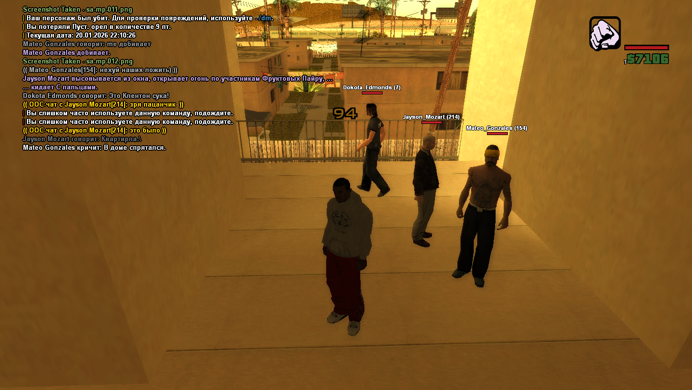Суть жалобы: Jayson_Mozart часа два назад с ним играли, запалили его на том что он рисует на нашей территории граффити. Побежали за ним - в итоге отпустили. Пару слов уронили, нас кореш забрал на машине, мы подьехали к нему я пару выкриков сделал он достал обрез начал нас тушить, в итоге у пацана не получился его мини-план и он оказался в стадии от моих пуль. Он без отыгровок без ничего открыл огонь, потом предлагал откатить ситуацию и отыграть что мы его типо побили чтобы наверное "НЕ ПОРТИТЬ ПЕРЕД ВСЕМИ УВАЖЕНИЕ ФРАКЦИИ". Про Фракцию ничего не говорю, но человек туповат. Второе: Щас с афк выхожу мне прилетает сразу в рыло стадия. Подьехали комерсы в четвером из машины убили меня и моих друзей. Дигл был в активе. Вот в чем прикол вкратце - Мы убили типа отправили его в PK, он приезжает потом как отсидел PK со своими друганами и стреляют в нас, когда ситуация уходит в ПК.