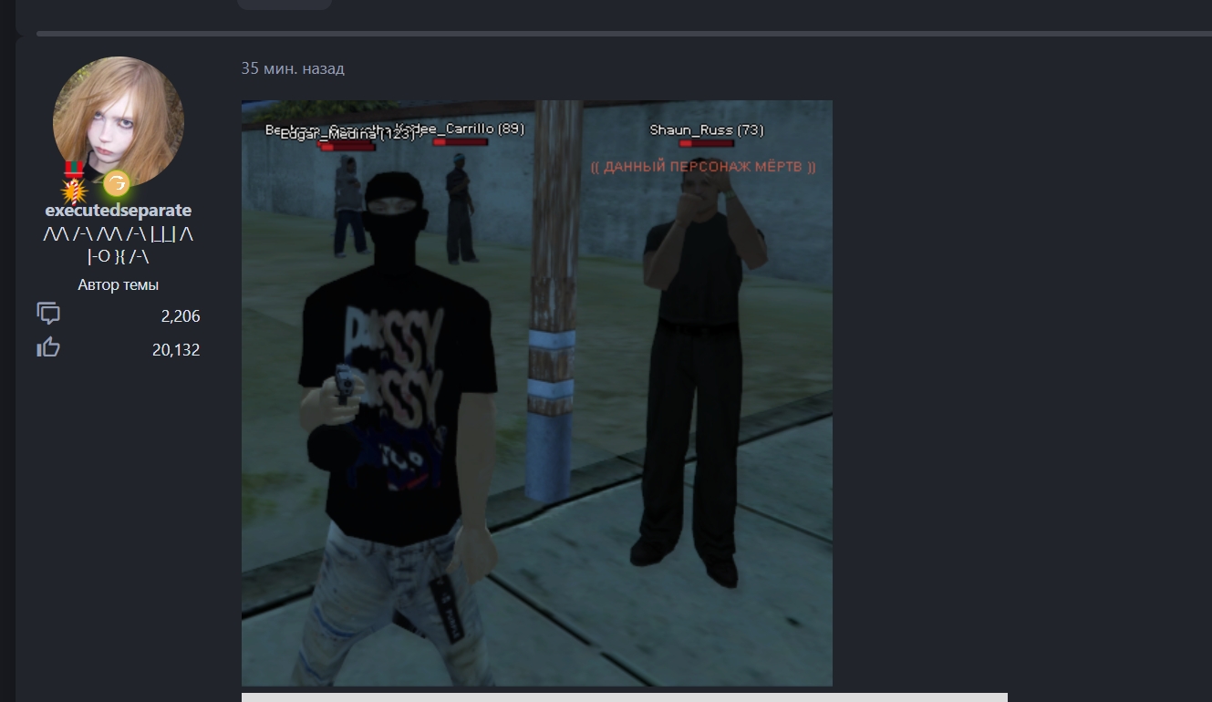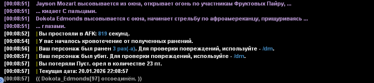 В хайд я закинул информацию для проверяющего, кидать на общую я не вижу смысла, т.к. фракция игрока "МАТЬ-МОЯ-ГАНДЖА" имеет свои взгляды и мировозрение на игру, которую они создают вокруг себя.