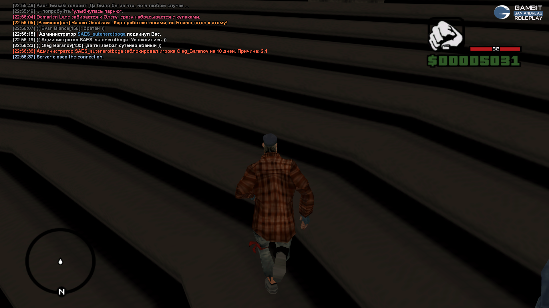 Суть жалобы: подрались с типом, и подкидывает нас обоих, нахрена? тоесть потосовок никогда не бывает, это запрещено правилами, будем на проекте сидеть без крайма, попивать кофейка и цивилить. Так же обиделся на оскорбление и откинул меня за 2.1, до этого просто успокойтесь сказал. За оск админа идет меньшее наказание, тем более сначала должно быть предупреждения