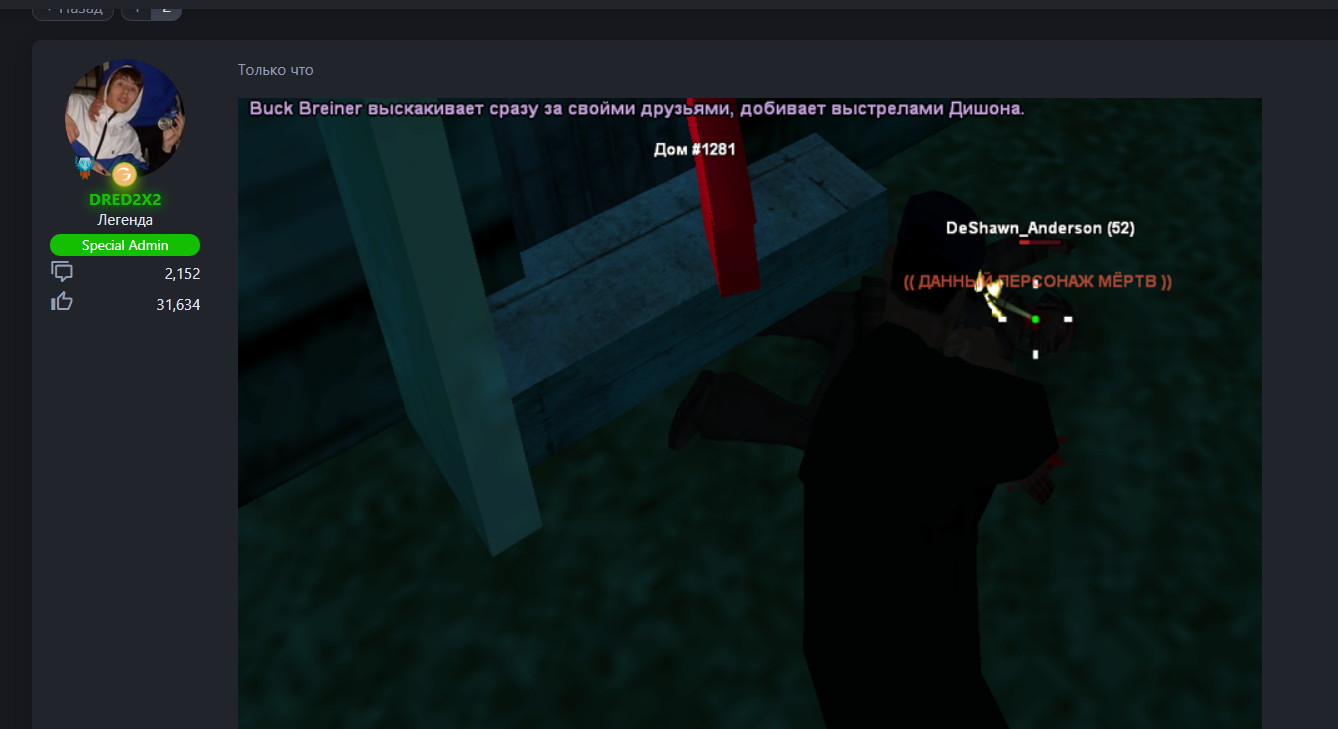 В остальном, причину на стрельбу я не просил ибо всё очевидно. Энтони вышел из игры ибо САМП залагал, но потом зашел и спокойно принял свою смерть.