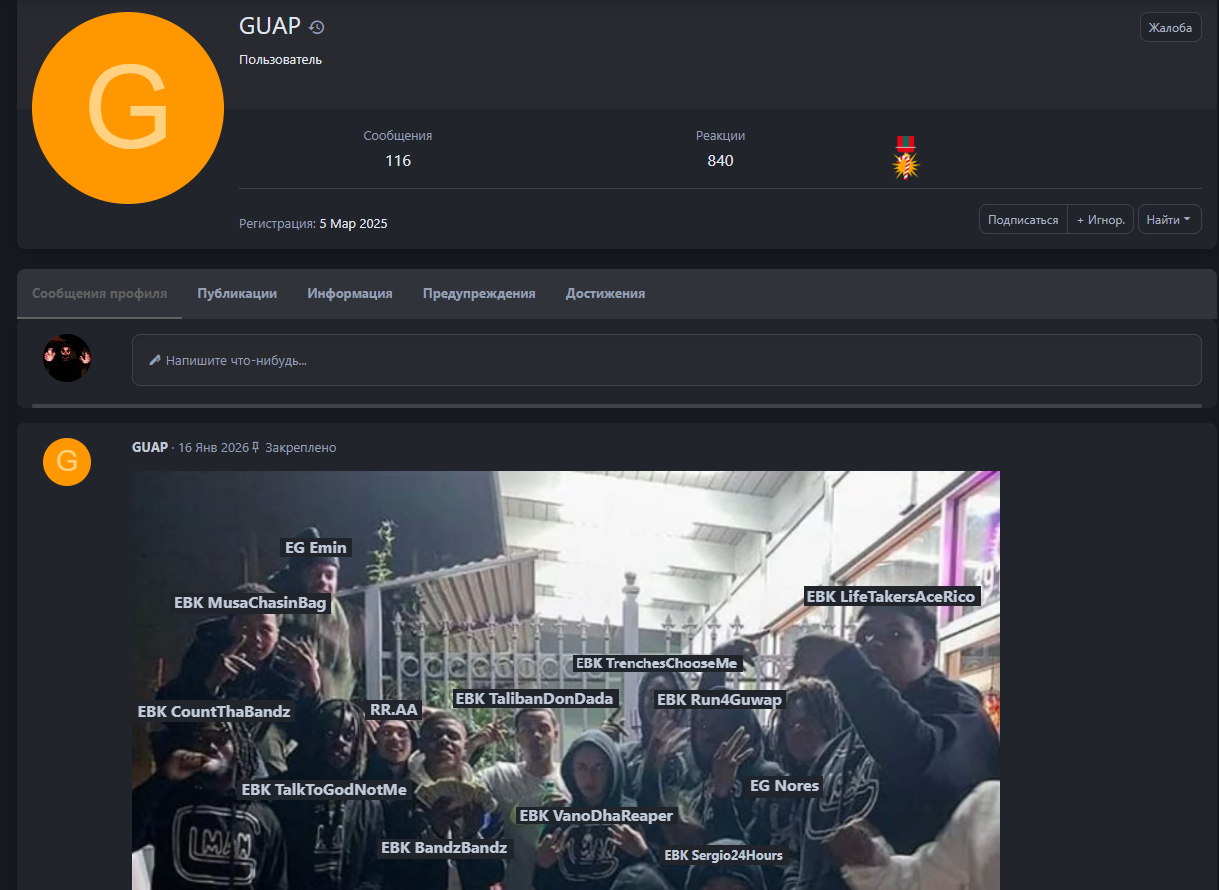 Объясню проверяющему. GUAP - форумник игрока как раз таки Myrie_Leonard. На своей же странице демонстрирует всех своих кентов шутерков, в том числе там EBK TrenchesChooseMe - его новый форумный ник Rankage, который в свою очередь является топикстартером фракции.