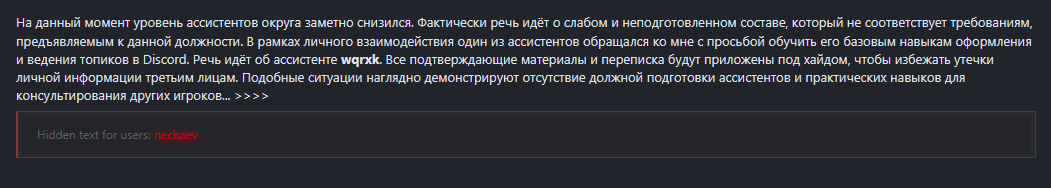 На данный момент уровень ассистентов округа заметно снизился. Фактически речь идёт о слабом и неподготовленном составе, который не соответствует требованиям, предъявляемым к данной должности. В рамках личного взаимодействия один из ассистентов обращался ко мне с просьбой обучить его базовым навыкам оформления и ведения топиков в Discord. Речь идёт об ассистенте wqrxk. Все подтверждающие материалы и переписка будут приложены под хайдом, чтобы избежать утечки личной информации третьим лицам. Подобные ситуации наглядно демонстрируют отсутствие должной подготовки ассистентов и практических навыков для консультирования других игроков... >>>>
