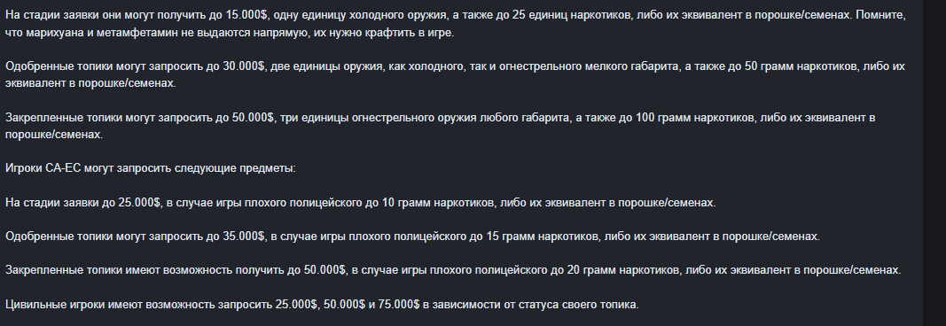 как вы смотрите на то, чтобы дать больше возможностей игрокам без СП и топиков организаций? Думаю, что сервер не убьёт то, что типы без топика смогут себе смешивать вышак наркоту с содой на среднее-хорошее качество, или траву в вышак фасовать, а также облегчённая добыча огнестрела и ножей.