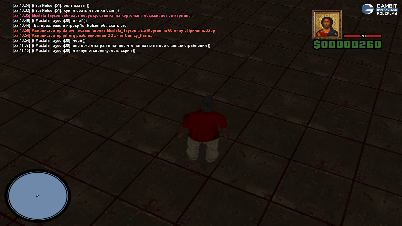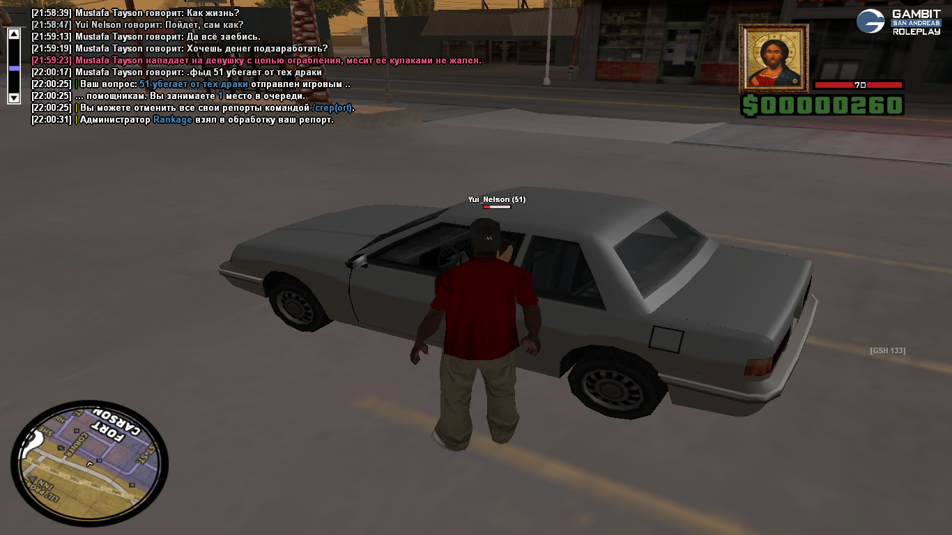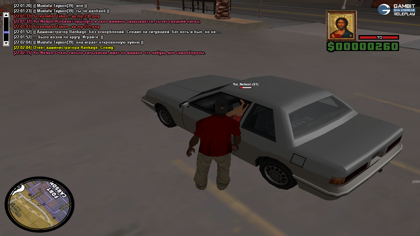 Затем я зову следуйщего админа, он благо хоть и понимает ситуацию и просит девушку выйти из машины, она выходит, я её добиваю так как драка по сути не завершилась и её хуйня с машиной была в откате после чего сажает меня в деморган по причине 22рр, тоесть зелёные зоны. Первый раз слышу что парковка сзади спавна Форт-Карсона является зелёной зоной, но там могли быть камеры, поэтому девушка вызвала /callw, и тут претензий быть не должно, это было в середине ситуации, и игры в свою пользу небыло, кроме той хуйни с машиной.