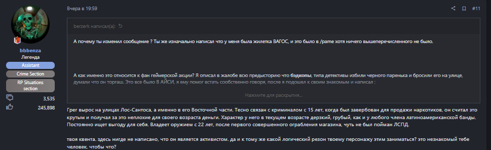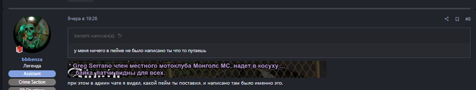 Суть жалобы: В первую очередь, ассистент выдавший наказание закрывает жалобы и не дает ответить другим участникам ситуации, удаляя их сообщения. Во вторых ассистент который проверил жалобу отклонил ее опираясь на то что «Монголы так не играют» откуда ты знаешь как они играют и как чувствовал меня мой персонаж в тот момент, я играл тогда опираясь не на то, что представляю мотоклуб, а на человеческие принципы в целом. Я не запрашивал разрешение у мотоклуба на проведение данного протеста, а действовал лично под свою ОТВЕТСТВЕННОСТЬ. Копы избили паренька, я собрал своих друзей, играя в своей компании. Я не провоцировал игроков какой либо крайм фракции играющей на кольце.