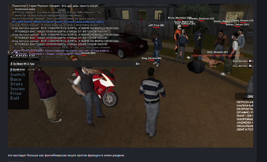 че за бред ты несешь? ты играешь члена антифа или что? какой смысл персонажу бандиту, члену мотобанды монголов брать и вступаться за какого то подростка из уличной банды. устраивать какой то марш свободы? это нелогично даже исходя из квенты твоего персонажа. ты просто не понимаешь что играешь. базару нет если бы ты попробовал организовать какой то протест против айс против которых щас действительно пытаются работать левые и латиноамериканская часть населения. тем более ты не имеешь никакого отношения к монголам и адекватных игроков, играющих серьезно будешь вводить в заблуждение и портить им игру своей несерьёзностью и непониманием ролевой состовляющей.