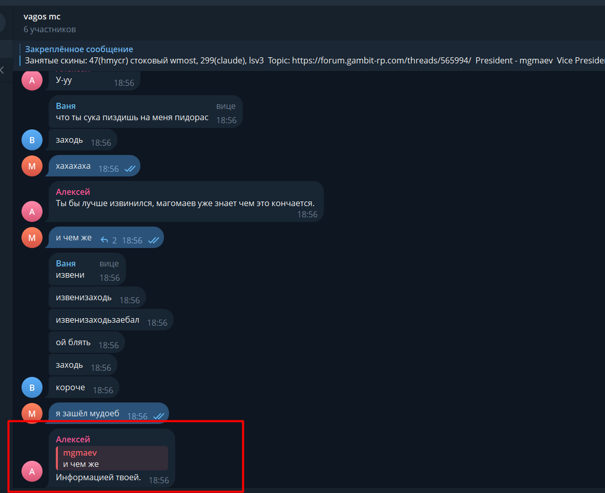 Так а нахуя ты будучи ассистом на алогине в тот момент посылаешь мой город нахуй, при этом рядом с тобой находились игроки округа, которым ты и слил место моего проживания и моим именимочень интересно получается Леха, за два года дружбы ты сам говорил что ты с Ростова, прошу это учесть. причем тут мои оскорбления в телеграмме? это было написано Ивану, я скинул те ранее скрины, тем самым показывая ваш троллинг и же что было кикнуты