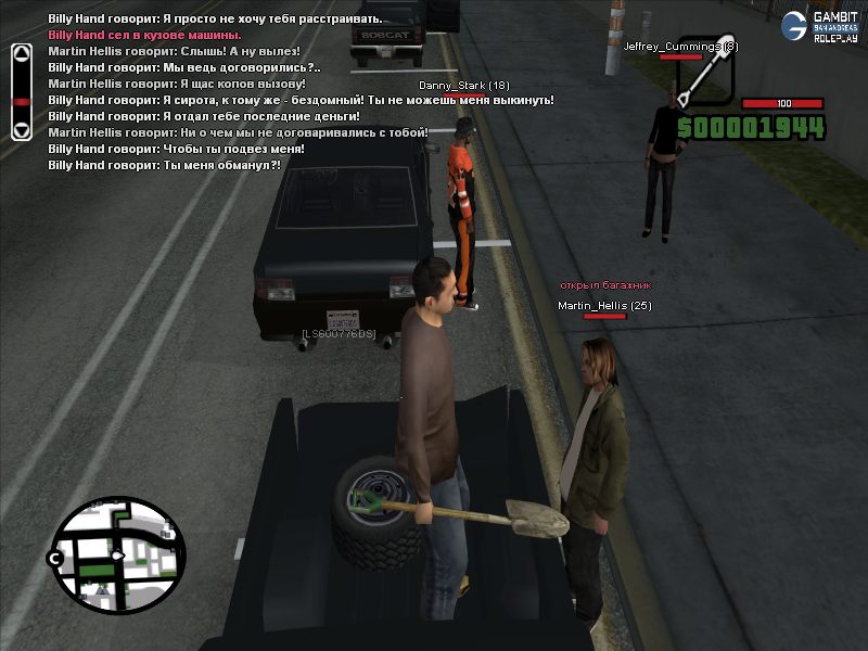 Началось всё с того что ты подошёл к игроку и начал просить у того денег в долг. Ваши персонажи никак не знакомы, и каков был мотив брать денег в долг у незнакомого человека? Ходишь с лопатой по всему штату, зачем? После залез к нему в пикап и сидел.