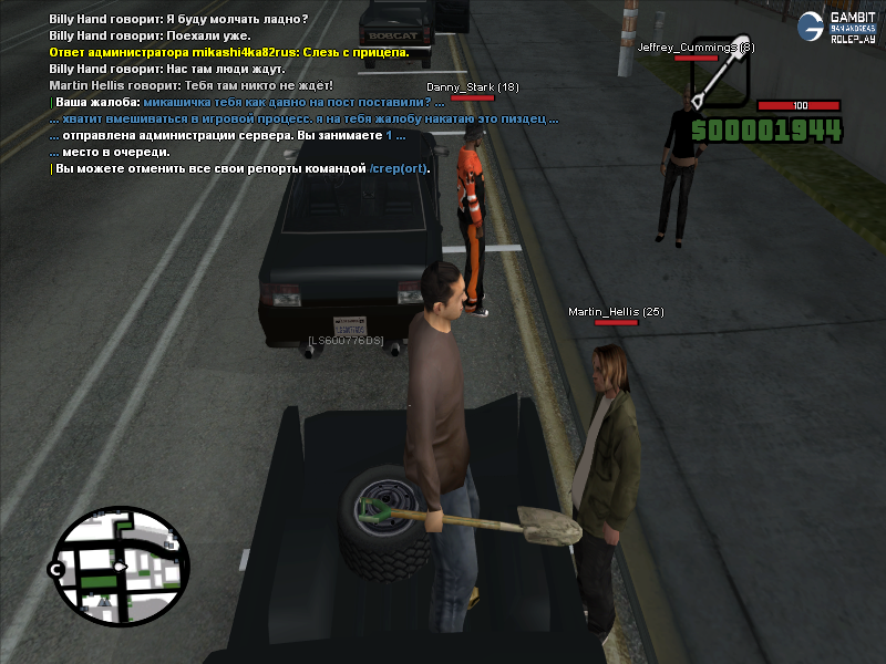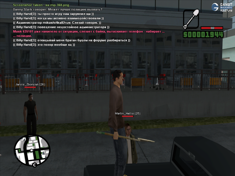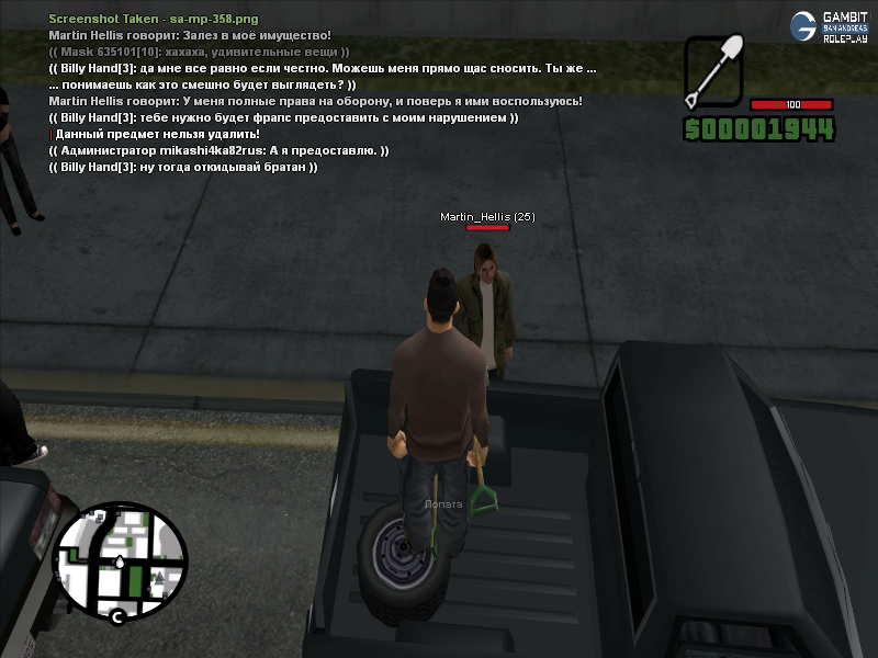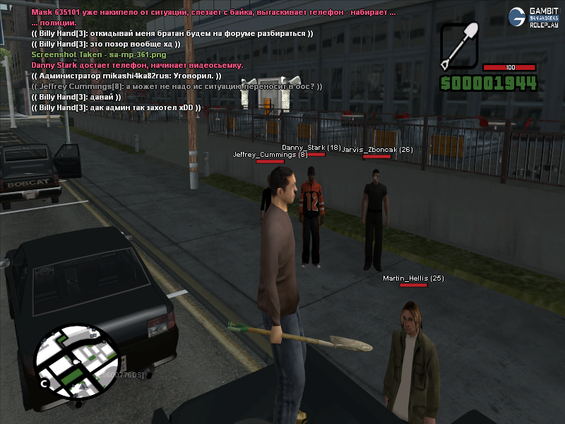 Согласен насчет лопаты, выглядела она абсурдно, но иного выбора у меня не было - убери бы я лопату в инвентарь, я бы нарушил правила сервера о крупногабаритном оружии. Лопата у меня в инвентаре осталась еще с прошлой по хронологии ситуации, которую вы кстати можете увидеть вот по этой ссылке https://forum.gambit-rp.com/threads/566774/#post-7265833