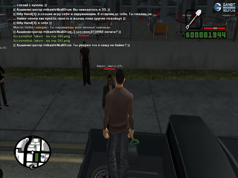 Продолжение ситуации. Внимание на чат - видно, что я и Мартин продолжаем отыгрывать свои роли, и нет ни единого намека на то, что моего персонажа кто-то СИЛОЙ выкинул из пикапа. Вылезти из машины я видимо должен был лишь потому что это не понравилось админу