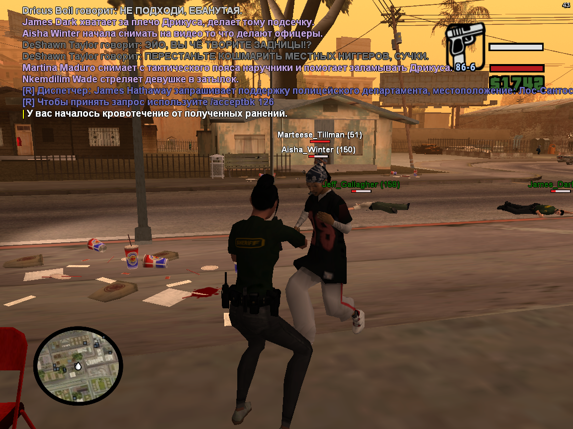 Суть жалобы: Мы в составе группы бандоподавления приехали на район разрабатываемой группировки, начали цеплять игрока с никнеймом Dricul Boil втроём. Мы три раза его пытались задержать, втроём, он отказался играть напрочь, а за то что мы его хватали за бицепс (за руки) его человека один решил начать стрелять по нам. К слову на месте было 4-5 сотрудников полиции и в далеке ещё несколько. Явное ПГ. Но смутило не это. Идёт перестрелка. И тут с кулаками на меня налетает халк персонаж Aisha Winter, играющая малолетнюю девочку хрупкую, которая налетает на вооружённых сотрудников полиции ведущих огонь в эту минуту. Это ПГ явное. Так же выдали бан до ЦК, а какое здесь собственно цк?