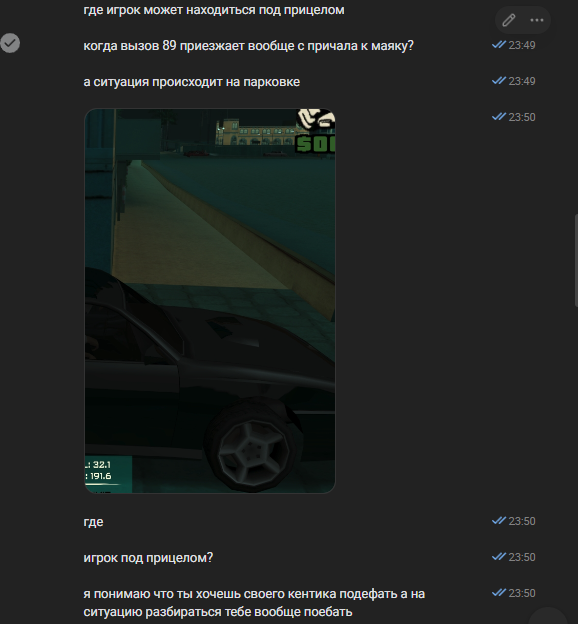 На этом фото его дружки пытались меня прикурить когда я вез его сородича в тюрьму, при этом этот же сородич писал мне остановиться, поговорим) Отличная игра по ООЦ инфе, дружище, продолжай меня называть объективно слабым игроком)