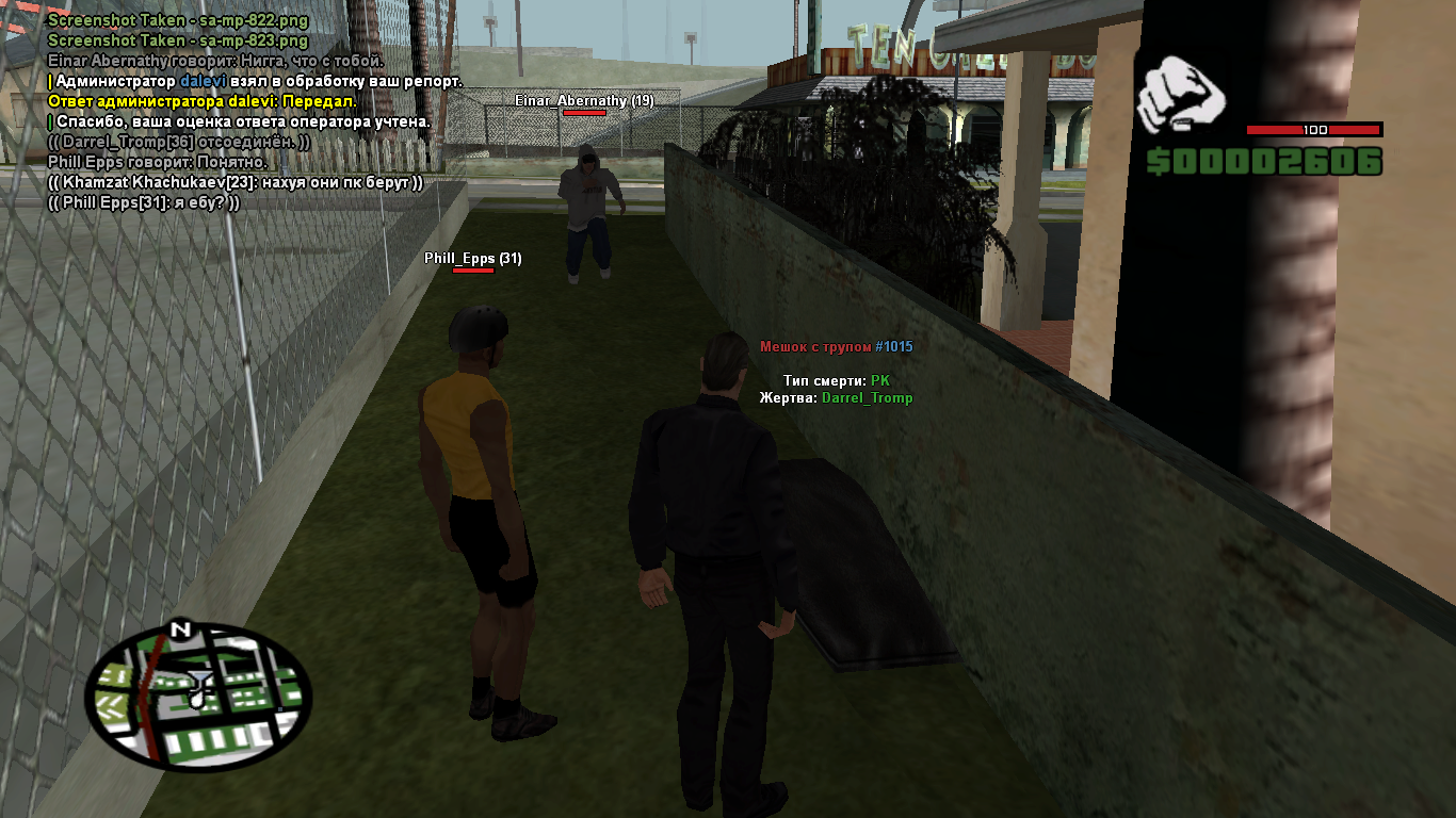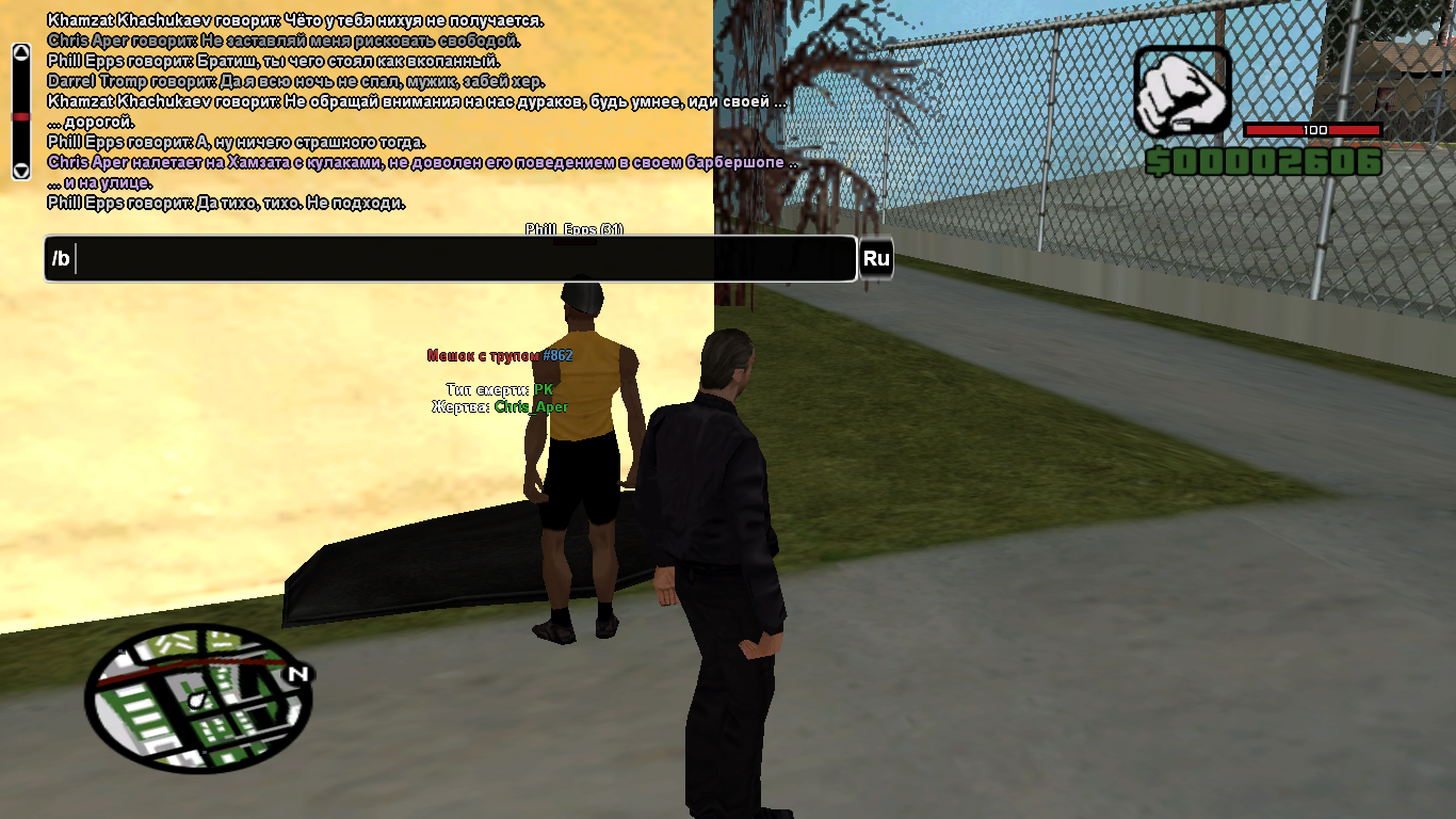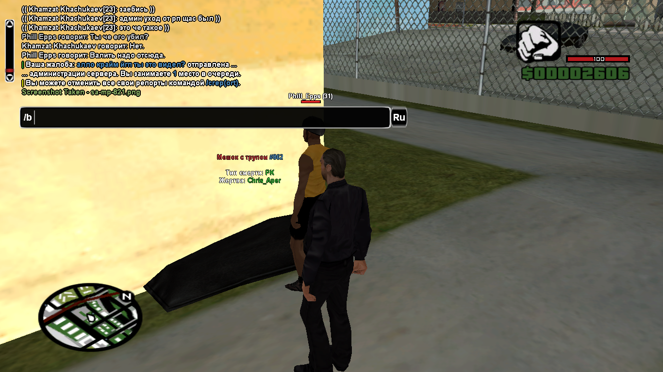Суть жалобы: Называли себя какой то супер профессиональной фуллрпшной фракцией, хотели нас прогнать с переулков из-за оос неприязни, после непродолжительного диалога они поняли что ничего не выйдет и пошли на крайние меры, начали драку в которой успешно одержали проигрыш, и вместо того чтобы как полагается доиграть ситуацию до конца, которую сами же начали, решили взять ПК посреди ситы. До этого Chris_Aper угрожал мне оружием, я заведомо зная что оно у него может быть при себе решил проверить его карманы дабы избежать будущей мести, обнаружив это оружие у него я хотел его забрать, на что он просто берет ПК, прошу наказать.